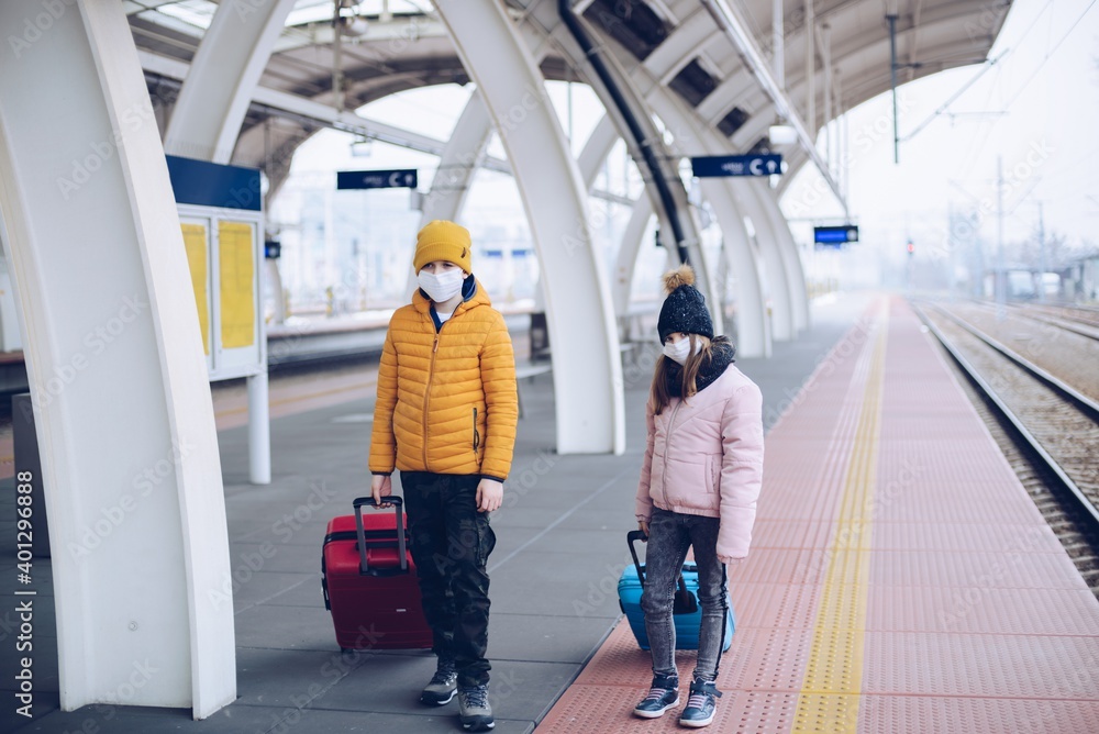 The children are standing on the platform of the train station. They want to go on winter holidays.