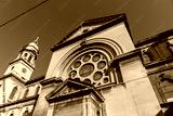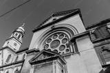 Stained stone exterior of an old church, elaborate rose window, beautiful architectural details, horizontal aspect
