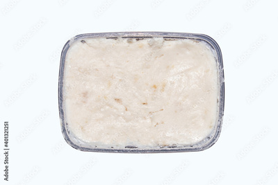 Lard for spreading on bread.Pork lard in a container on a white background.Pork fat with garlic and spices.