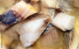 Herring in oil with spices.Herring fillet-pieces in oil.Herring marinated in oil.
