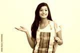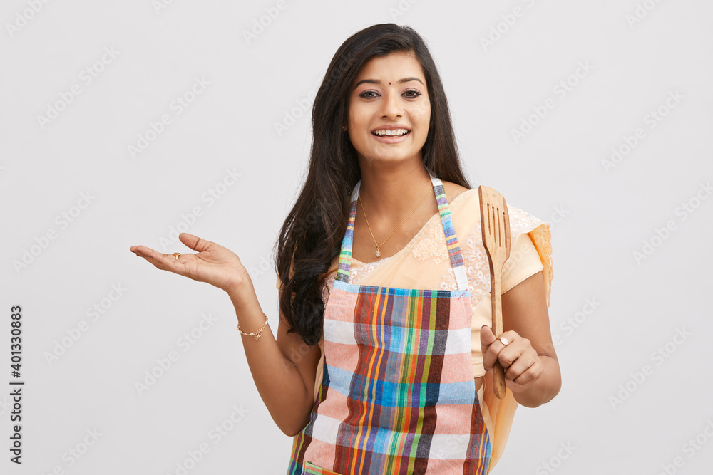 Cheerful Indian young woman holding wooden skimmer and greeting on white.