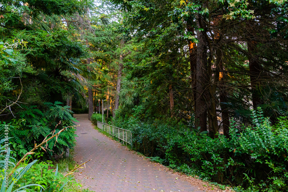 Picturesque tropical place in urban. Path with walkway under green palm trees