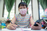 Little child girl learning on smart phone at home with wearing face mask,Social distance during quarantine, Online education concept