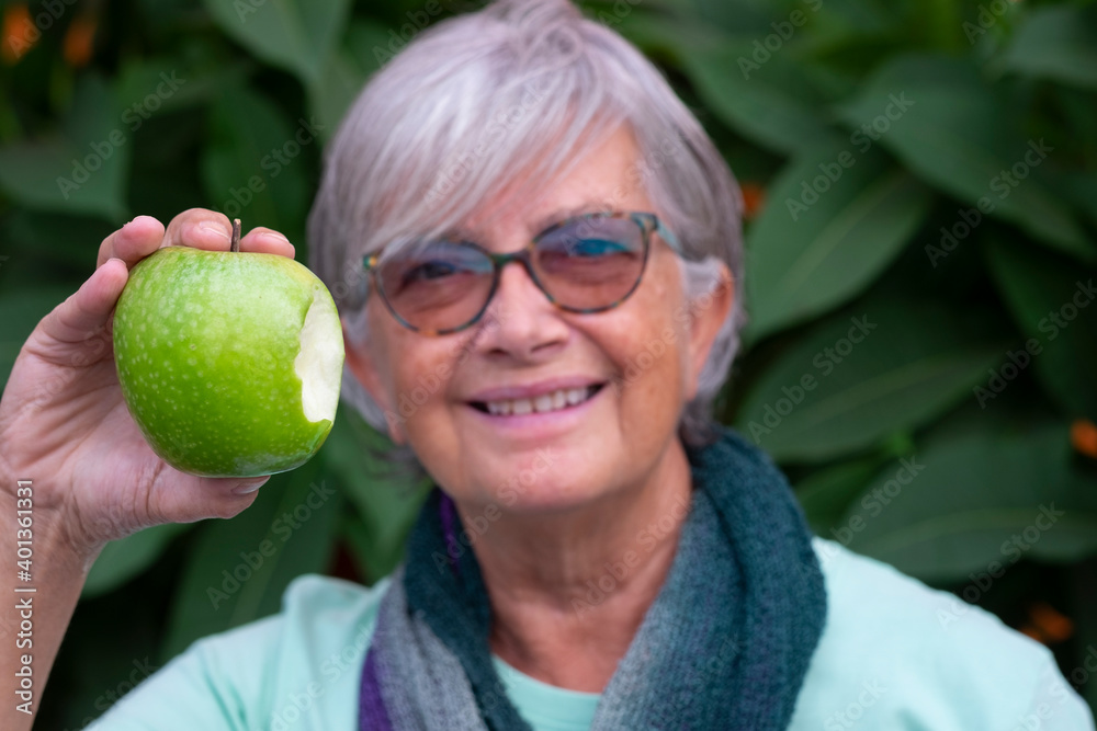 Blurred portrait of a white-haired smiling older woman holding a green apple with a bite near her face. Healthy eating and diet concept