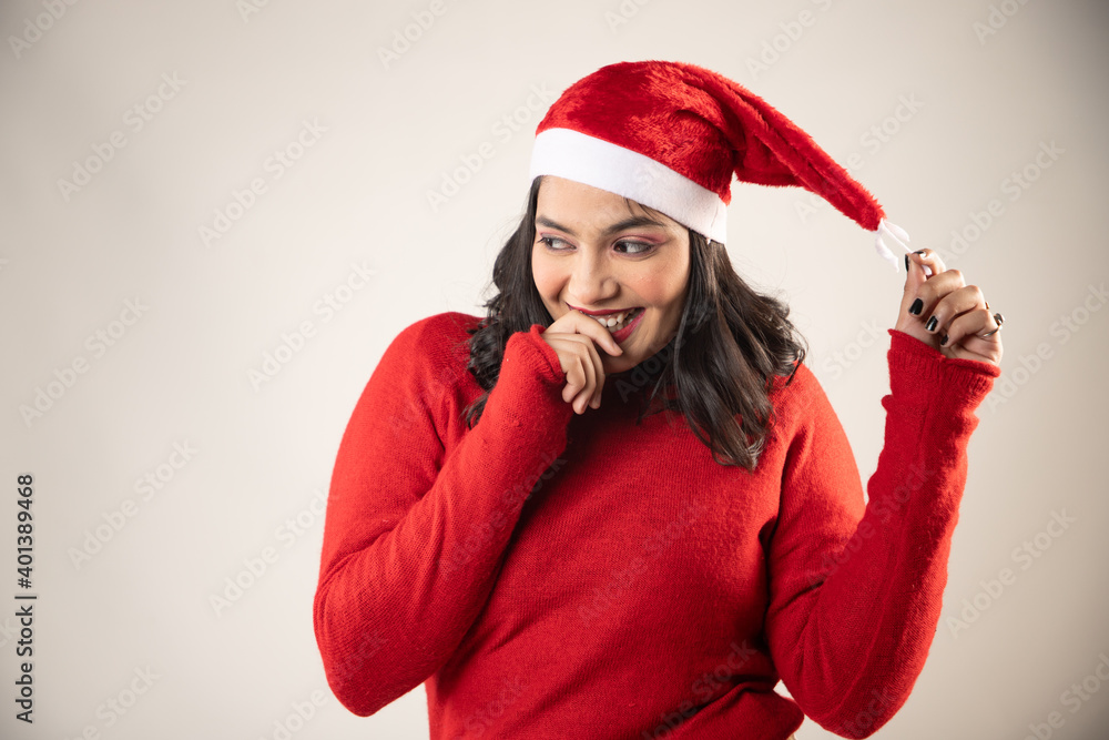 woman in santa claus hat smiling and looking toward right