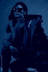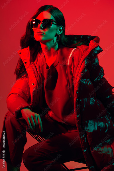 Fashion portrait of elegant trendy woman in red down jacket.