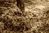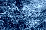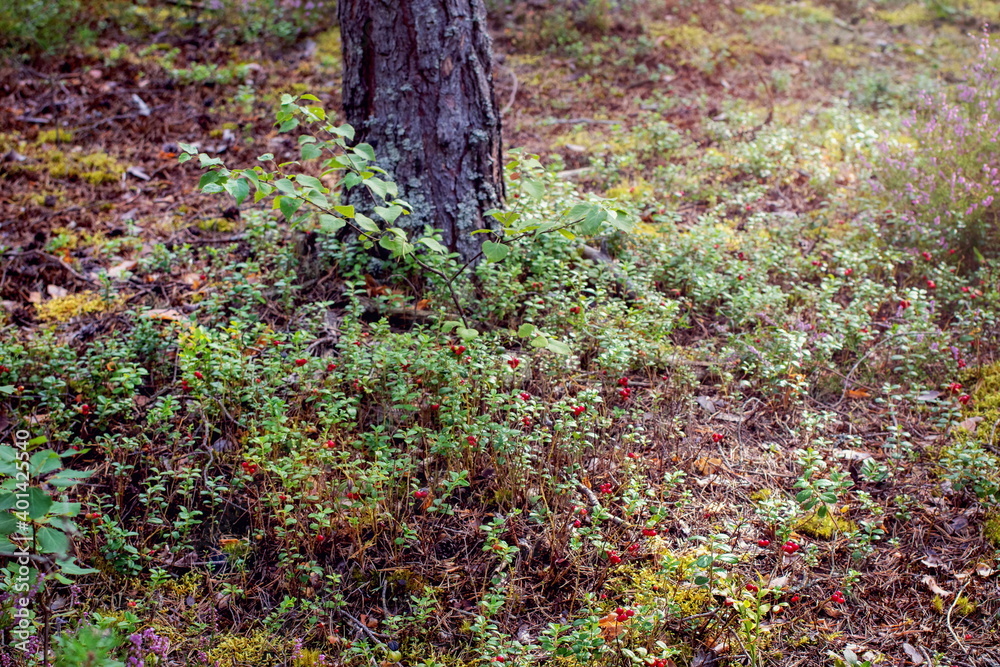 Lingonberry clearing in the forest under a tree (forest berry)