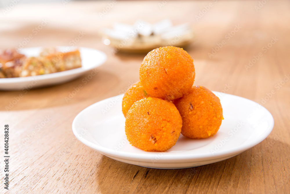 Pile of orange Indian sweets Motichoor Laddu or Laddoo