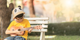 An Asian little boy wearing glasses is happily playing the ukulele. Asian little child is trying to play the ukulele with a fully happy moment.