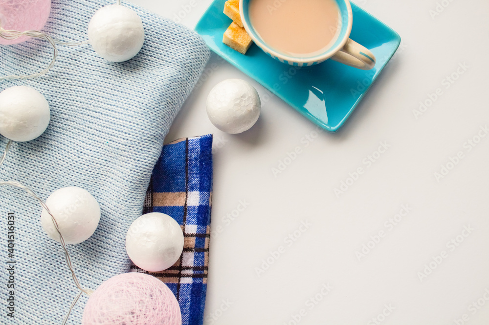 Imitation of snow on blue fabric near the blue cup of coffee with milk