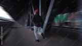 young guy is running over tunnel bridge in Hamburg Germany, Cool zoom or motion speed effect, New Year's resolutions, Jogging or running in the urban city.