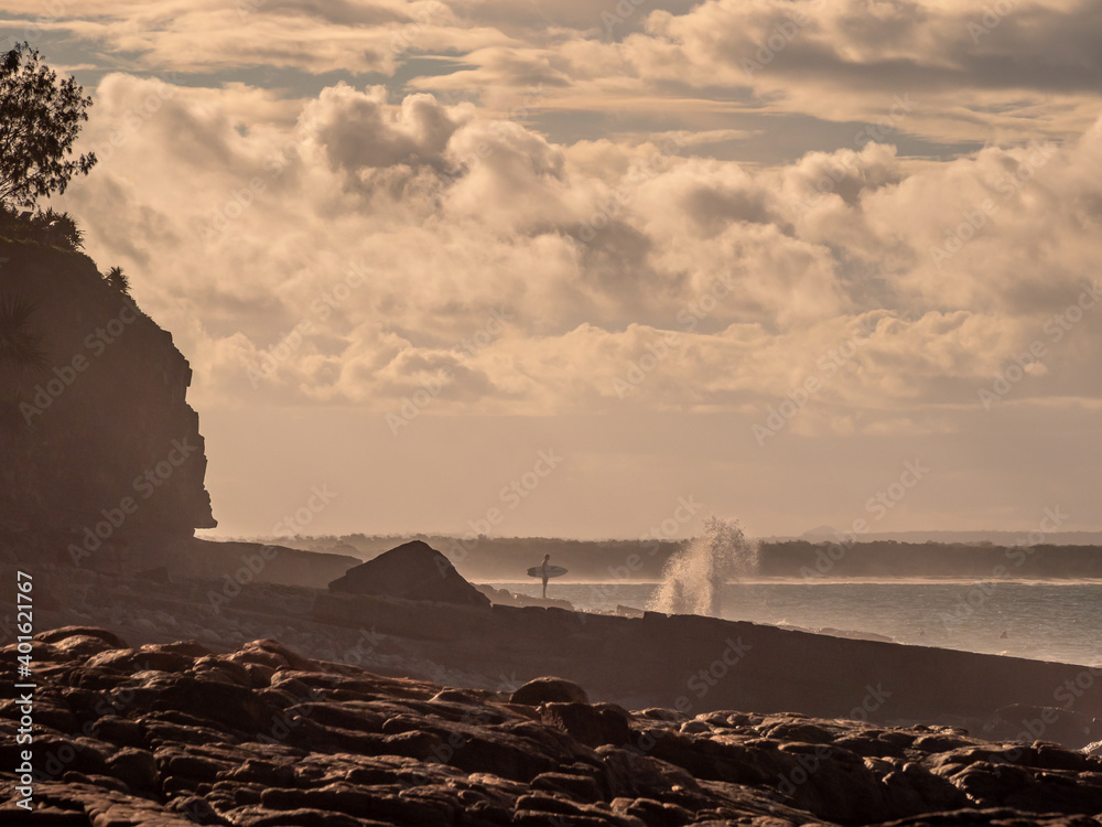 Golden Afternoon Coastal Scene with Surfer