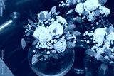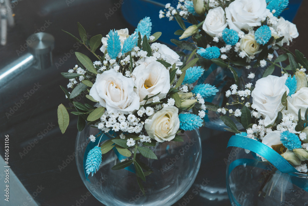 vases with bouquets of white roses and blue flowers, decor on a glass table