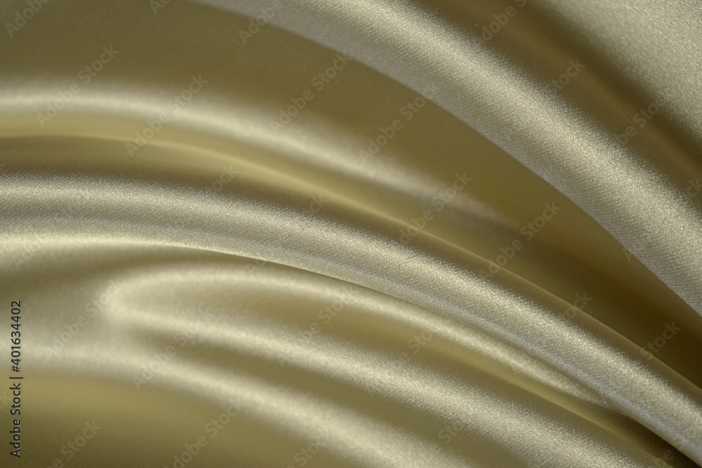 Abstract gold background. Beautiful silk satin cloth texture background. Soft wavy folds on shiny fabric. Luxurious golden material background with copy space for your design.