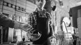 Caucasian Customer Pays for Coffee and Pastry with Contactless NFC Payment Technology on Smartphone to a Handsome Barista in Blue Checkered Shirt. Contactless Mobile Payment in Cafe Concept.