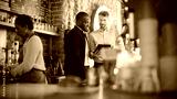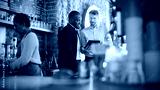 Multicultural Coffee Shop Owners Meeting Behind the Counter and Working on Tablet Computer and Checking Inventory in a Cozy Loft-Style Cafe. Successful Restaurant Managers and Barista at Work.