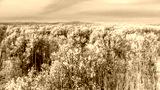 Aerial panoramic drone view on snow covered winter field with birch trees in frost. Cold sunny december day in wild nature park, Samara, Russia