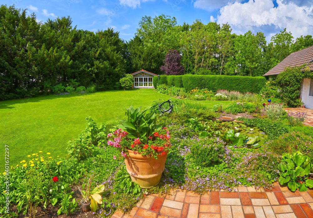 Well-kept garden with a colorful flower bed, garden shed and pond.