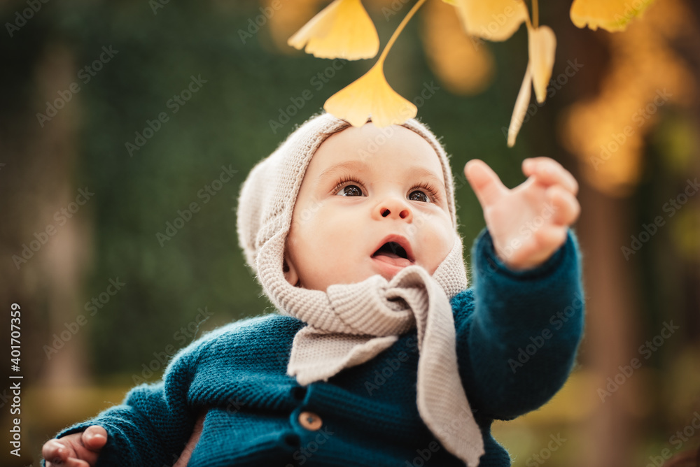 Bebé intentando de coger unas hojas de un árbol con gorro en invierno.