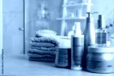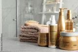 MYKOLAIV, UKRAINE - AUGUST 08, 2020: Set of L'Oreal hair care cosmetic products on light grey stone table in bathroom. Space for text