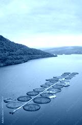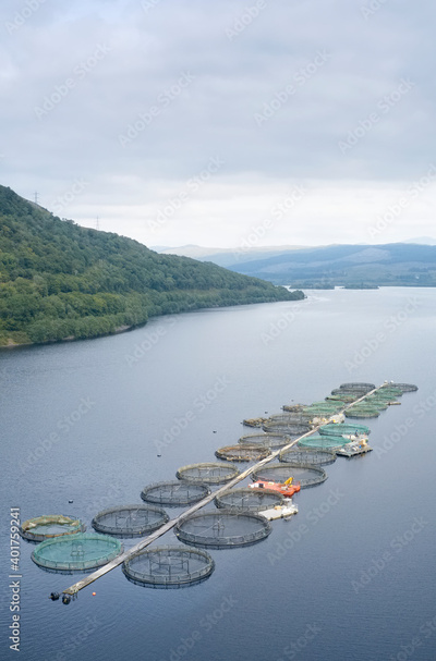 Fish farm salmon round nets in natural environment Loch Awe Arygll and Bute Scotland