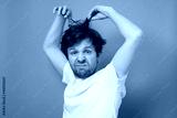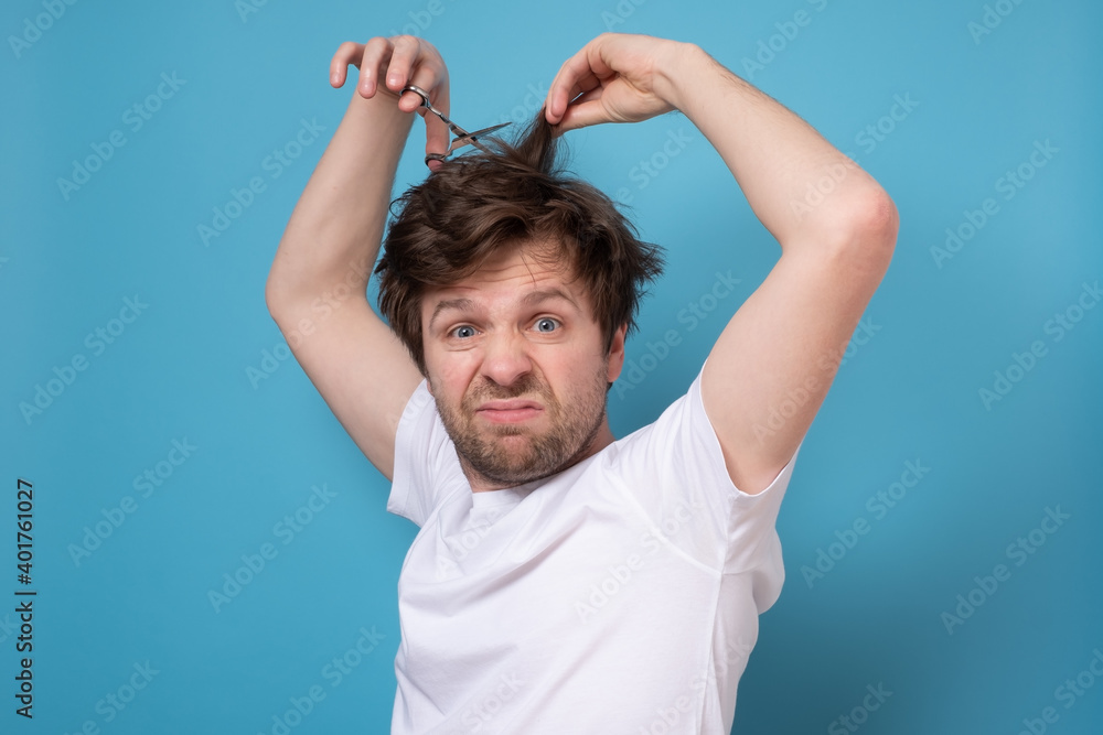 Caucasian shaggy man trying to make a hairstyle by himself with scissors.