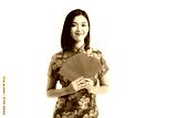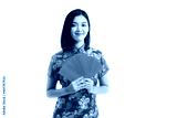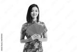 Asian girl wearing Chinese traditional dress cheongsam or qipao holding ang pow red packet monetary isolated on white background