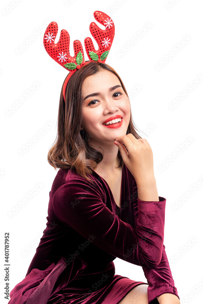 Happy smiling Asian girl wearing christmas deer costume isolated on white background.