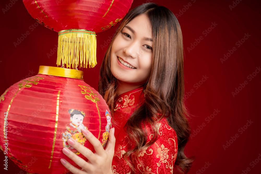 Portrait of Asian girl in Chinese traditional red dress holding Chinese lantern on red background. Chinese new year