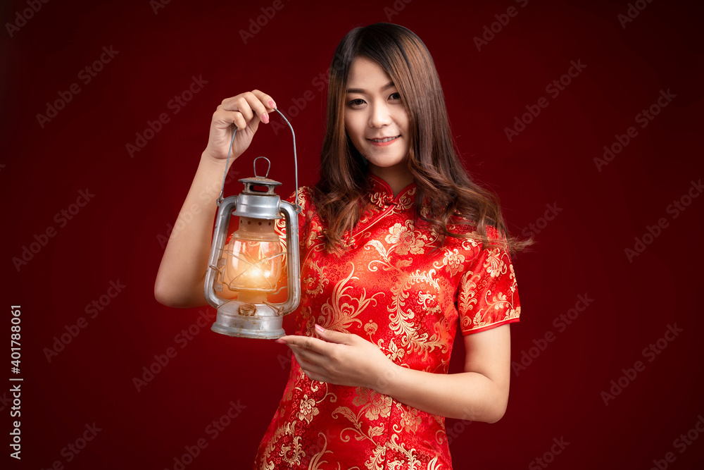 Beautiful young woman wearing a red Chinese dress holding lantern isolated on red background.