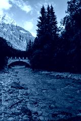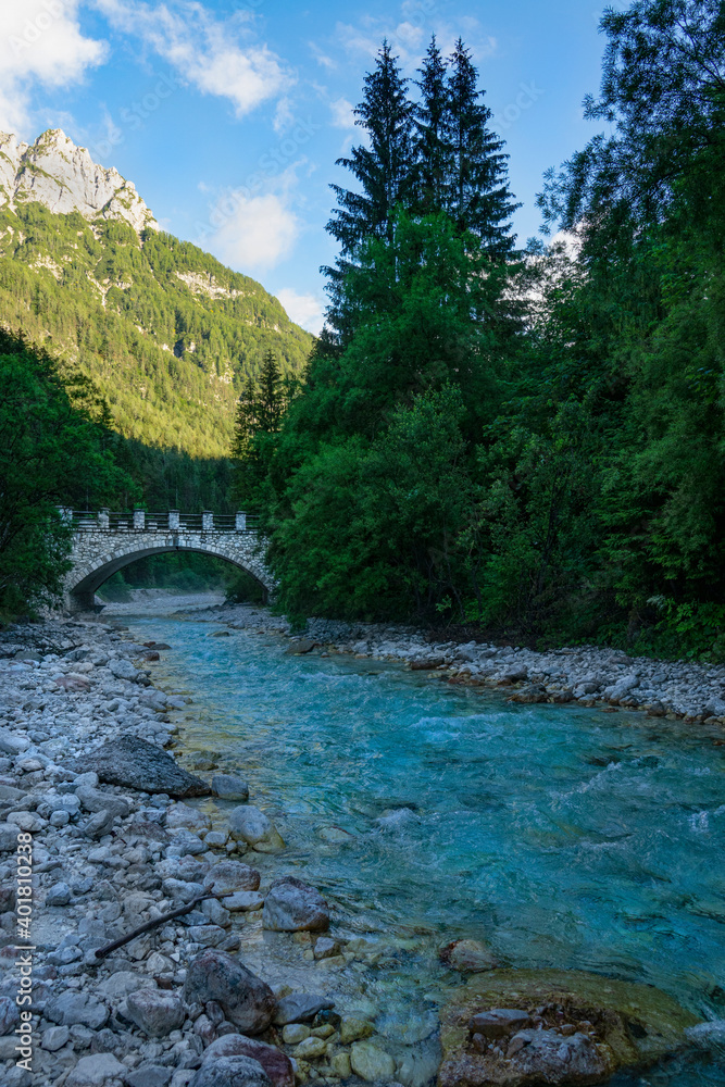 VERTICAL: Turquoise colored mountain stream courses under an old stone bridge.
