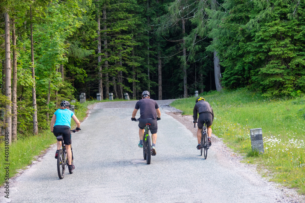 Three unrecognizable tourists bike up an empty asphalt road near Kranjska Gora.
