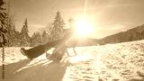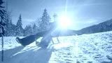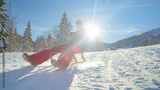 CLOSE UP: Joyful woman is having fun sledding down a picturesque snowy hill.