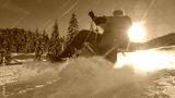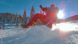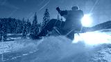 CLOSE UP: Sparkling snowflakes fly into camera as woman sleds down a snowy hill.