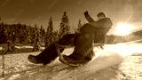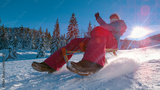LENS FLARE: Joyful woman sleds down snowy hill in the sunny Slovenian mountains.