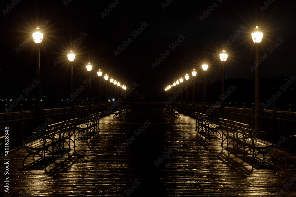 Lamp Posts and Rain Reflections Glow at Pier 7