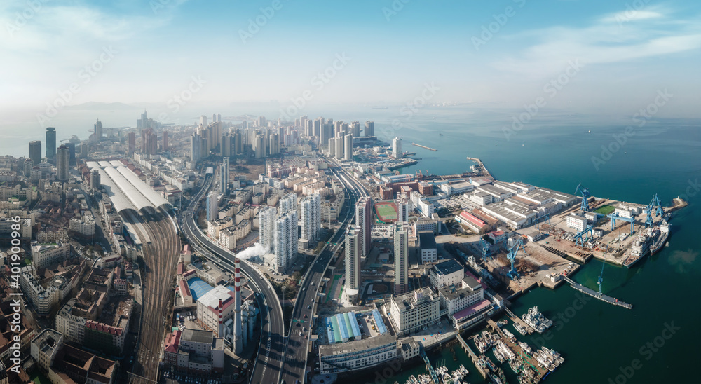 Aerial photography of the skyline of modern urban architectural landscape in Qingdao, China