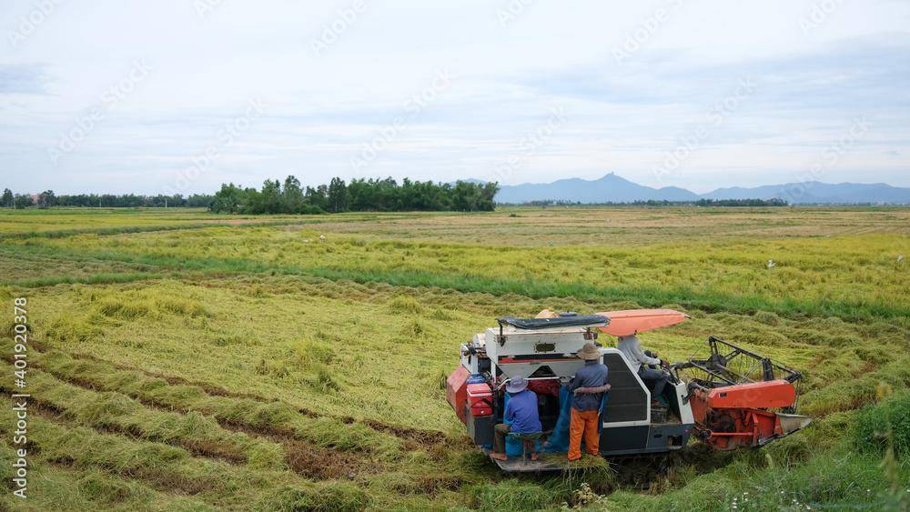 The farmer is working in the field with a harvester. Kombain collects on the rice field crop. Agricultural machinery in the field, people use the industrial reaper, combine Harvester cut rice plants