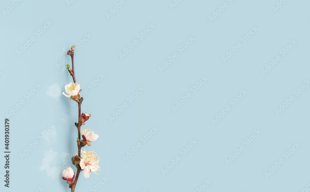 Spring or summer blooming with white flowers fruit tree branch against baby blue background. Fresh floral banner with copy space. selective focus. Minimal