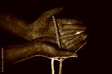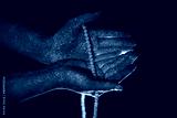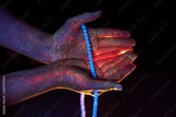 Rosary in hand, prayer. Light through the palms of your hands in ultraviolet, God and religion, beads. Divine light through your fingers, prophet Muhammad