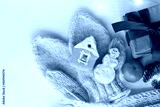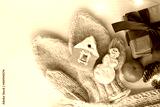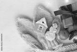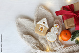gingerbread house with a light in the window and a smiling snowman on the table with a gift, a tangerine, a spruce branch and a garland with a scarf and mittens. warm cozy mood of winter holidays