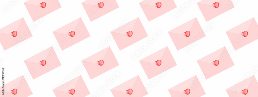 Pattern composition of Pink Envelope with pink diamond heart for Valentine’s day or wedding. Banner.