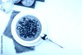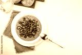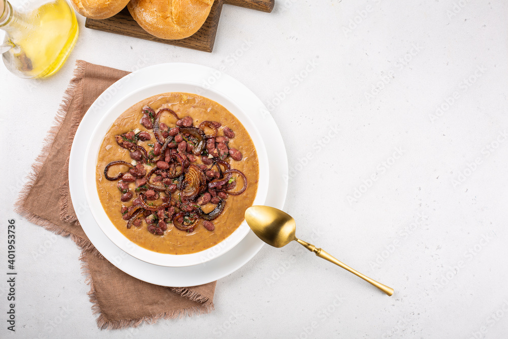 Vegan Red Kidney Bean Soup with caramelized onions and herbs. Top view. Copy space.