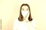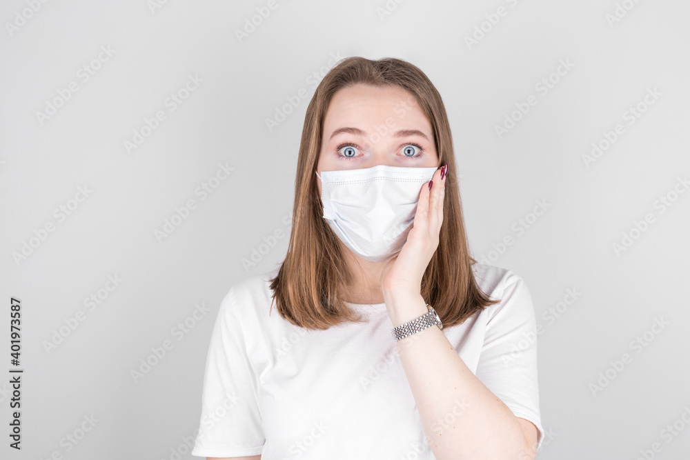 Portrait of a young surprised woman in a medical mask isolated over grey background. Young girl patient stands against the wall background wirh fear in her eyes.