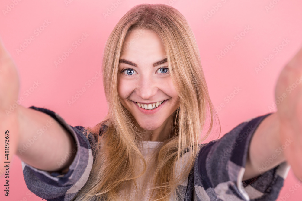 Portrait of a happy young girl with straight hair, in a shirt, taking a selfie on a pink background