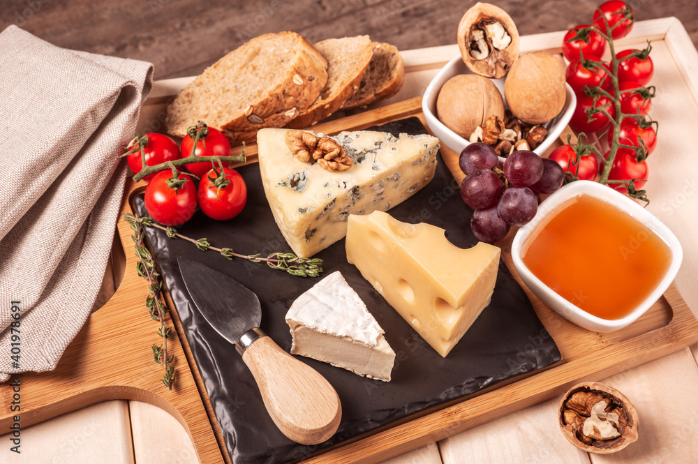 wooden tray for breakfast with assortment different cheeses cheese, honey, walnuts, tomato. cheese dessert on the wooden tray. side view