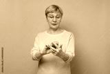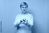 Image of adult mature woman with long white hair wearing shirt holding cellphone isolated over gray background