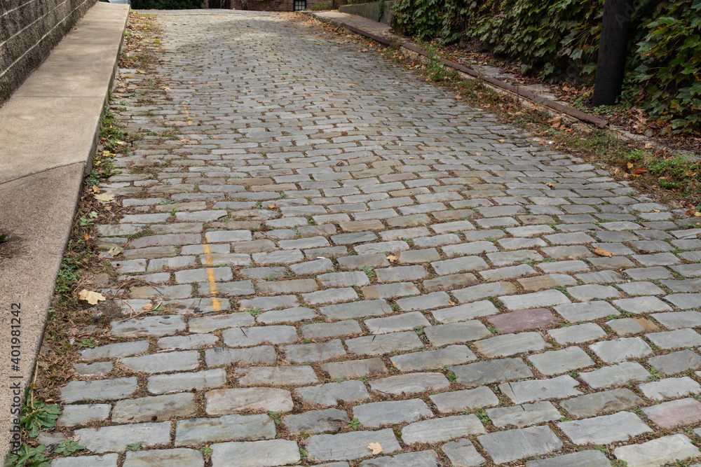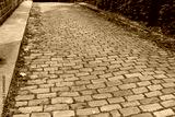 Alley street paved with gray stone blocks set in a running bond pattern bordered by curbs and walls, horizontal aspect