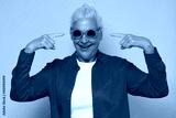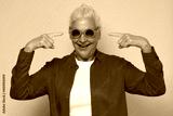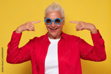 Cheerful old woman wearing trendy sunglasses, isolated on yellow background laughing.