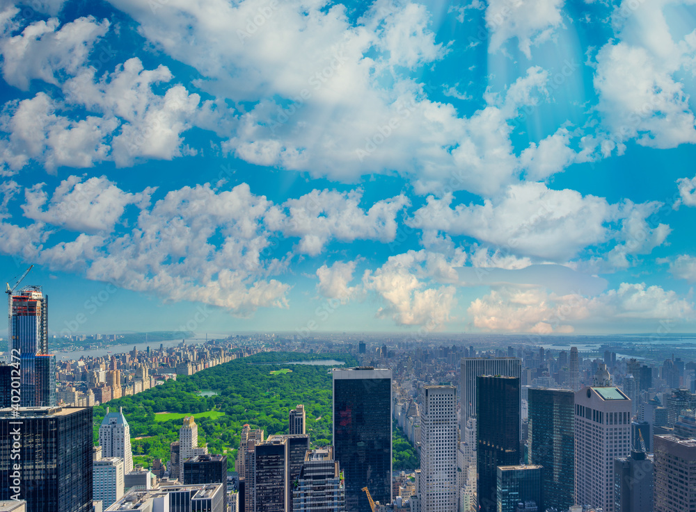 Panoramic aerial view of New York City skyline and Central Park
